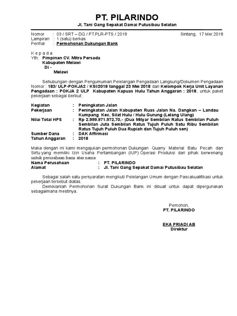 Dengan adanya surat dukungan dari perusahaan pusat/distributor tentu juga secara tidak langsung merupakan jaminan bahwa perusahaan pusat/distributor akan memberikan jaminan berupa keaslian barang, layanan purna jual dan garansi yang yang diberikan. Longsoran bukit pelangi v pagu dana : Kumpulan contoh surat permohonan untuk kerjasama rekomendasi bantuan dana permohonan maaf beasiswa atau keperluan yang lain.